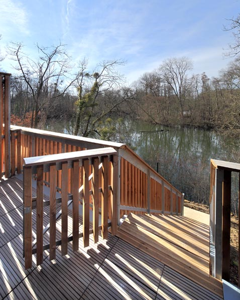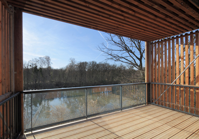 Un bâtiment belvédère basse consommation en bois au bord de l’eau sur un site exceptionnel en berge de Seine. L’orientation est optimisée pour garantir à tous les logements une façade sud qui donne lieu à des terrasses, balcons ou oriels généreux offrant des vues sur l’eau. Le rez-de-chaussée inondable est traité par un soubassement poreux en gabion et accueille les parkings. La rigueur constructive, notamment sur les questions d’isolation et de ponts thermiques, permet d’atteindre la cible BBC par des moyens simples.