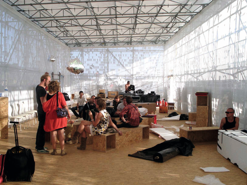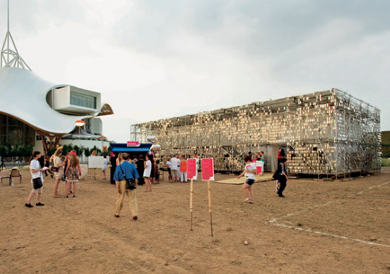 Installée au pied du Centre Pompidou-Metz en 2010 lors du festival « Imaginez Maintenant », la plateforme Forum est un projet expérimental qui pousse jusqu’au bout la question de la réutilisation des matériaux d’un bâtiment éphémère. Issue d’un concours d’architecture, elle a accueilli durant une semaine conférences, débats, studio radio et installations artistiques. Ce « bâtiment-outil » à la volumétrie simple est construit avec des matériaux bruts ou réutilisables. Sa peau vibrante, composée de 10 000 feuilles d’aluminium, réagit à la lumière et au vent, créant une atmosphère unique.