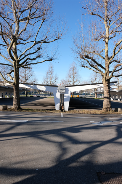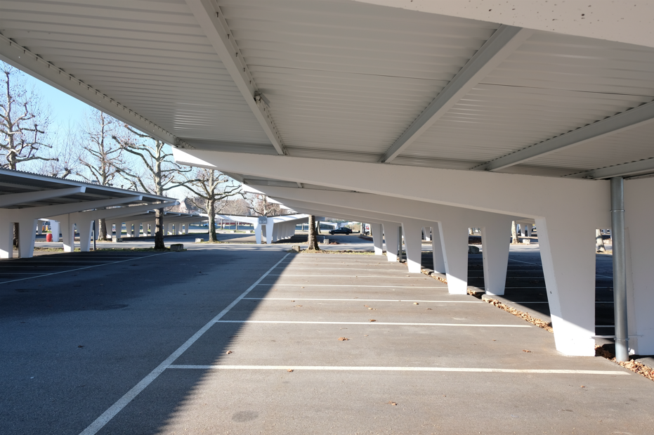 Les 28 ombrières des années 1950, situées sur un parking arboré d’une entreprise privée, ont été entièrement rénovées : toitures en fibro-ciment amianté remplacées, réparations structurelles et béton, renouvellement des installations électriques et mise en peinture des portiques.